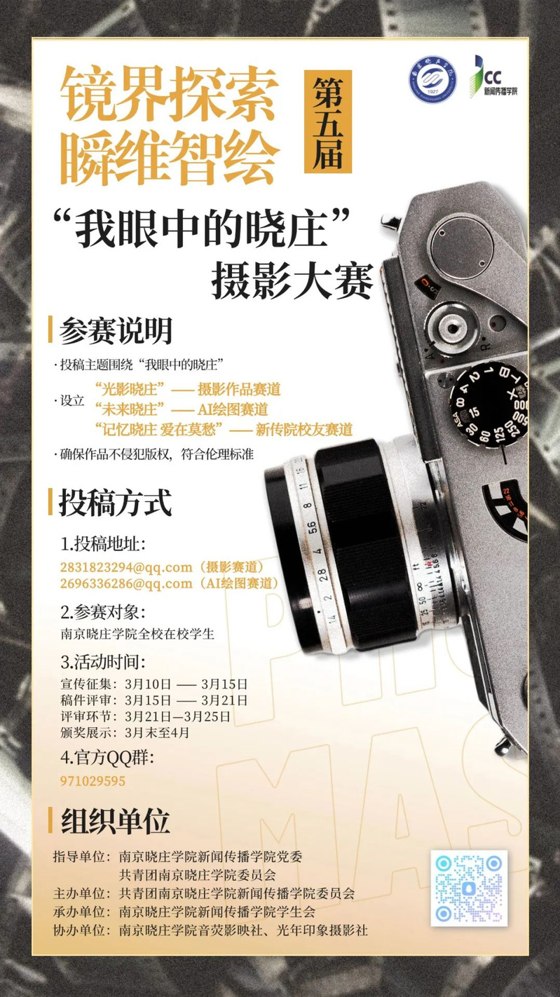 新闻传播学院面向全校学生举办“镜界探索,瞬维智绘”——第五届“我眼中的晓庄”摄影大赛,大赛创新设立“光影晓庄”摄影作品赛道、“未来晓庄”AI绘图赛道和“记忆晓庄”新传院校友赛道,鼓励学生以多元视角展现晓庄的自然之美、人文之韵与创新之力,用艺术作品献礼校庆。自3月上旬启动以来,活动收到全校近五百位学生投稿,征集到校友老照片百余张,充分彰显出青年大学生与校友的爱校荣校之心。