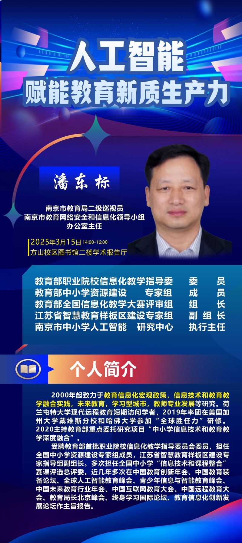 活动中,潘东标以《人工智能赋能教育新质生产力》为题作了专题报告,系统分析人工智能为教育带来的机遇与挑战。学院为承办的首届“人工智能+教育”智能体应用创作设计大赛举行颁奖典礼。大赛以“陶行知、大爱晓庄、教学做合一”为主题,吸引了全校11个学院提交的170余件作品,涵盖智能体开发、AIGC图像与视频创作三大赛道。经专家评审,评选出一等奖20项、二等奖30项、三等奖40项,充分展现了晓庄学子在人工智能与教育融合领域的创新实践能力。