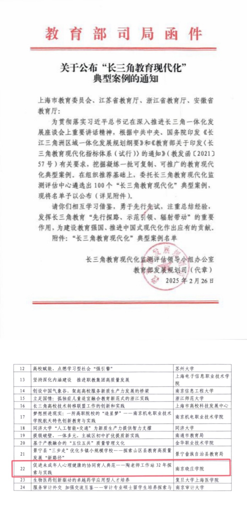 近日,教育部发展规划司公布“长三角教育现代化”典型案例遴选结果,经单位推荐、第三方评估中心遴选等程序,我校报送的《促进未成年人心理健康的协同育人典范—陶老师工作站32年探索与实践》入选100个“长三角教育现代化”典型案例。
