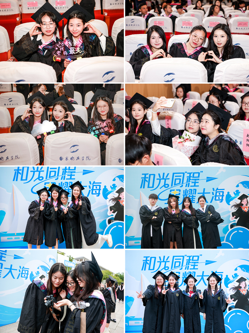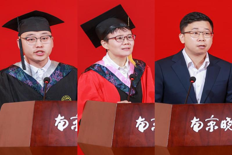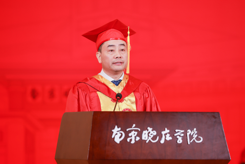 毕业生代表、环境科学学院韩保吉同学分享了他在晓庄的“地理坐标”,展现了晓庄“学子”自信昂扬的精神面貌和勇往直前的奋斗姿态;教师代表、文学院张谦芬教授代表母校教师向毕业生赠言,她以“爱满天下”的晓庄精神为内核,鼓励学子们在生活中寻找属于自己的那份“热爱”,于广阔天地间成就最好的自己;优秀校友代表、新闻传播学院2015届毕业生,现任宿迁市宿城区陈集镇党委副书记、镇长徐众结合毕业后的成长经历,通过分享三段感悟,鼓励同学们要以行知精神照亮前行之路,时刻铭记母校的教诲,感悟晓庄大爱,投身基层,服务群众,以实干精神书写青春答卷。