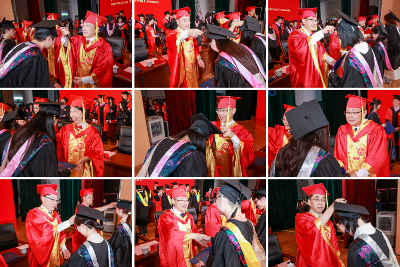在学位授予仪式环节,校领导及学位评定委员会委员为毕业生代表颁发学位证书,并扶正流苏。