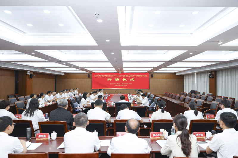 7月18日,丽江师范学院2025年中层干部能力提升专题研讨班在我校莫愁校区开班。丽江师范学院校长陈本辉,党委副书记彭鸿昌,副校长朱桂香、张兰胜,我校党委书记张策华、副校长王本余出席开班式,丽江师范学院47名中层干部参加活动。开班式由王本余主持。