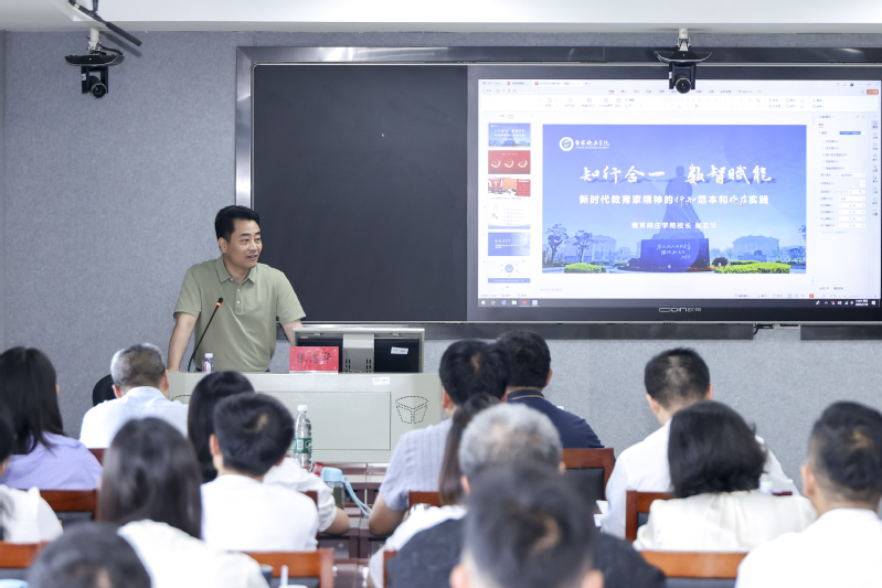 开班式后,我校党委书记张策华、校长张志华分别为研讨班作专题辅导报告。张策华以《新时代地方师范高校领导干部成长的几点思考》为题,紧扣新时代要求,结合晓庄办学实践和个人思考,深入阐释了新时代高校领导干部的核心素养。他强调,领导干部要争当“四个表率”:自我革新的“先行者”、信念坚定的“实干家”、改革发展的“排头兵”和事业发展的“护航员”,切实推动学校高质量发展。张志华在《知行合一 数智赋能——新时代教育家精神的行知范本和晓庄实践》报告中,以传承和践行陶行知教育思想为脉络,全面展示了晓庄弘扬教育家精神的创新实践。报告重点解读了数字化赋能教育教学改革、服务社会发展的特色路径,系统分析了当前面临的挑战与对策,为学校深化改革提供了实践方案。