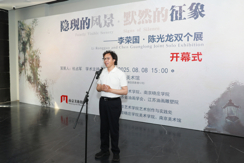 张凌浩代表南京艺术学院向两位画家表示祝贺。他表示,李荣国毕业于南艺,又回到母校在艺术创作管理岗位深耕多年,其作品萦绕着强烈的怀旧情愫,是对记忆的打捞和时代的凝视,践行了南艺“闳约深美”的校训。他指出,李荣国的“风景”与陈光龙的“人物”虽形态不同,但同为 “70 后” 艺术家,他们共享时代基因,在精神层面契合,此次展览为两校艺术交流搭建了平台,并期待能够激励更多青年画家创作出更多无愧于时代的绘画精品。