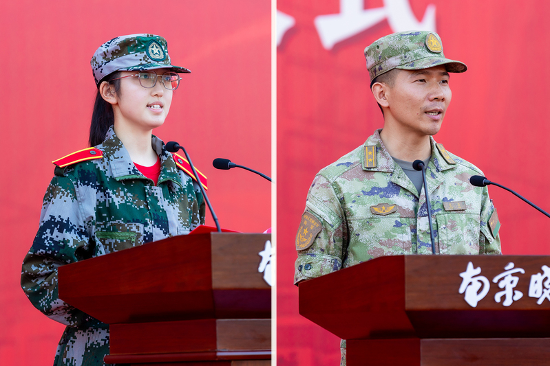 电子工程学院新生吉慧作为受训学生代表发言,围绕“传承、团结、奋进”三个关键词分享自身体会。她呼吁大家珍惜军训机会,以坚定信念和饱满热情迎接大学生活的各种挑战。