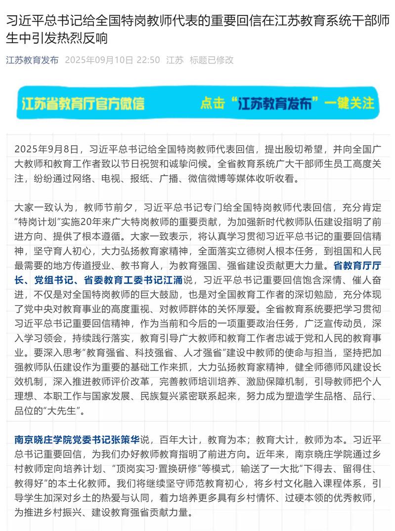 在第41个教师节来临之际,习近平总书记给全国特岗教师代表回信,充分肯定他们展现了人民教师的情怀和担当,深切勉励他们为推进乡村振兴、建设教育强国作出新的贡献,并向全国广大教师和教育工作者致以节日祝贺和诚挚问候。我校作为中国乡村师范教育的发祥地,习近平总书记的回信在学校立刻引发热烈反响,江苏省教育厅官方微信平台“江苏教育发布”、《江苏教育报》《南京日报》等多家媒体报道了我校师生的学习体悟。