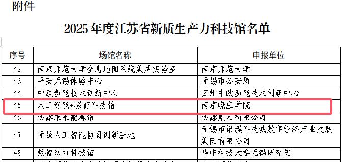 近日,江苏省科协公布了2025年度江苏省新质生产力科技馆入选名单,我校申报的“人工智能+教育科技馆”名列其中。