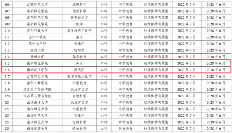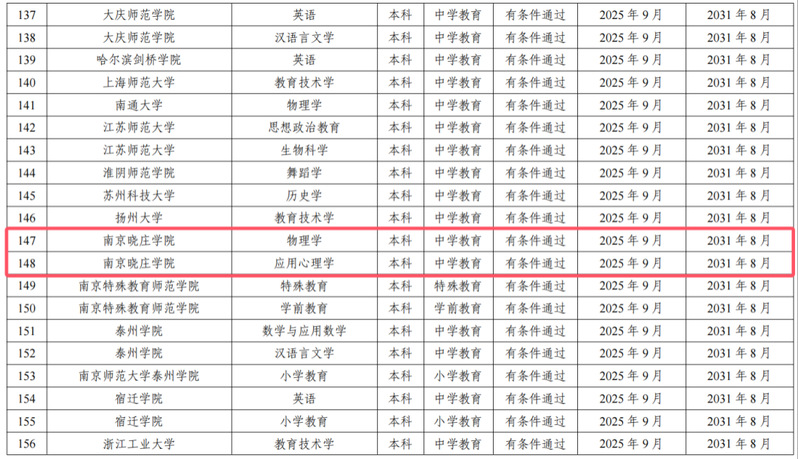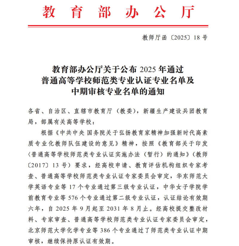近日,教育部办公厅发布《关于公布2025年通过普通高等学校师范类专业认证专业名单及中期审核专业名单的通知》(教师厅函〔2025〕18号),我校物理学与应用心理学专业通过第二级专业认证,认证结论有效期六年(2025年9月至2031年8月),英语与历史学专业通过中期审核,继续保持原认证有效期。