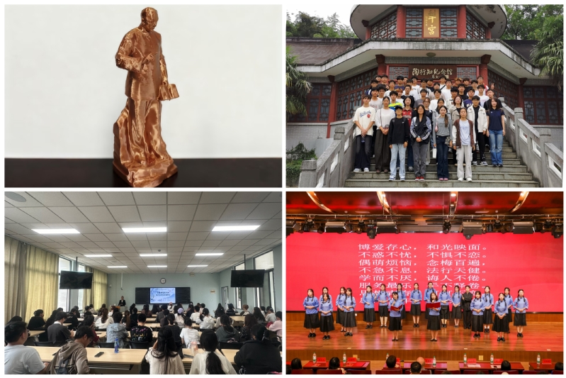 环境科学学院地理信息科学专业与复合材料工程专业师生协同完成学校南门陶行知纪念像的三维重建与3D打印工作。地信师生运用无人机进行高精度数据采集与建模,复材师生则攻坚3D打印工艺,最终以复合材料精准复刻陶像。这一项目不仅是“教学做合一”理念在科技领域的生动实践,也展现了跨学科协同育人的丰硕成果。环科院同步举办“笔绘行知魂,躬行教育梦”手绘大赛与“重读行知・践行真教育”读书分享会,融合艺术表达与理论研习,推动学风建设与精神传承双向赋能。