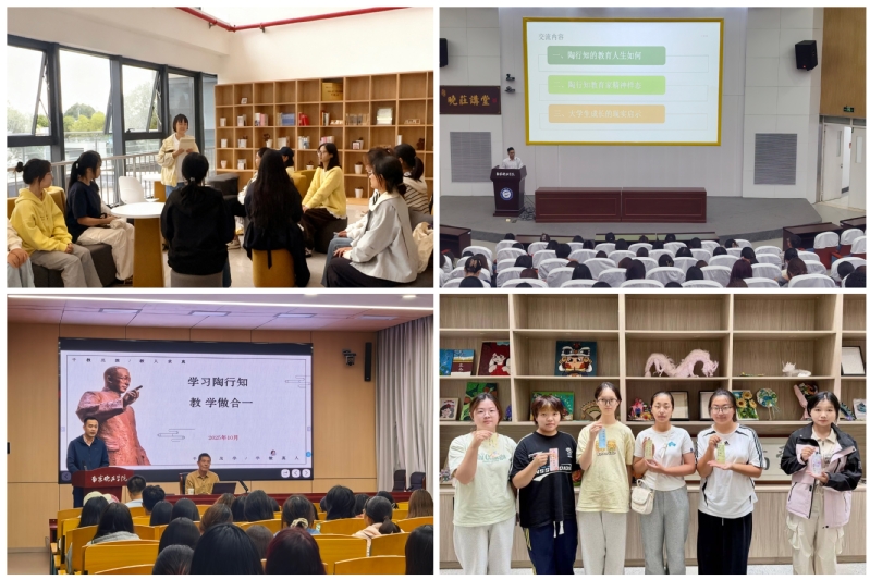 教师教育学院精心策划的三项特色活动: “陶”醉书海分享会以“线上征集+线下研讨双线推进,学子们在小先生工作室通过深度研讨与角色朗读沉浸式感悟经典;“行知承韵巧手传薪”作品展集中展出56件三笔字、手工、绘画类获奖作品,并设互动体验区,供参与者制作“大漆”纪念品、书写经典语录,使传承触手可及;同期开展的“继往开来承陶志’作品征集更创新引入AIGC创作赛道,鼓励学子以科技赋能传统,数字化演绎行知理念,为纪念活动注入青春创新活力,三项活动累计覆盖师生超500人次。