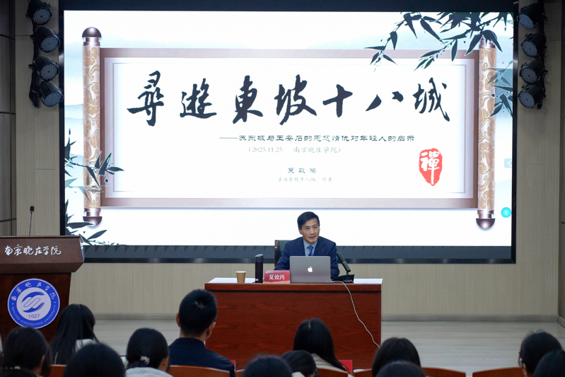 11月25日,由校党委宣传部主办、文学院承办的学术讲座《寻游东坡十八城——苏轼与王安石的思想情仇对年轻人成长的启示》在行知楼100室顺利举行。杭州市东坡研究会副会长夏效鸿应邀担任主讲,市委网信办网络传播处相关同志、校党委宣传部负责人、文学院相关负责人及近100位师生代表现场聆听了讲座。