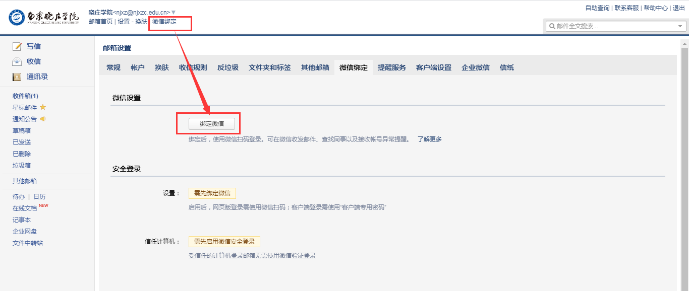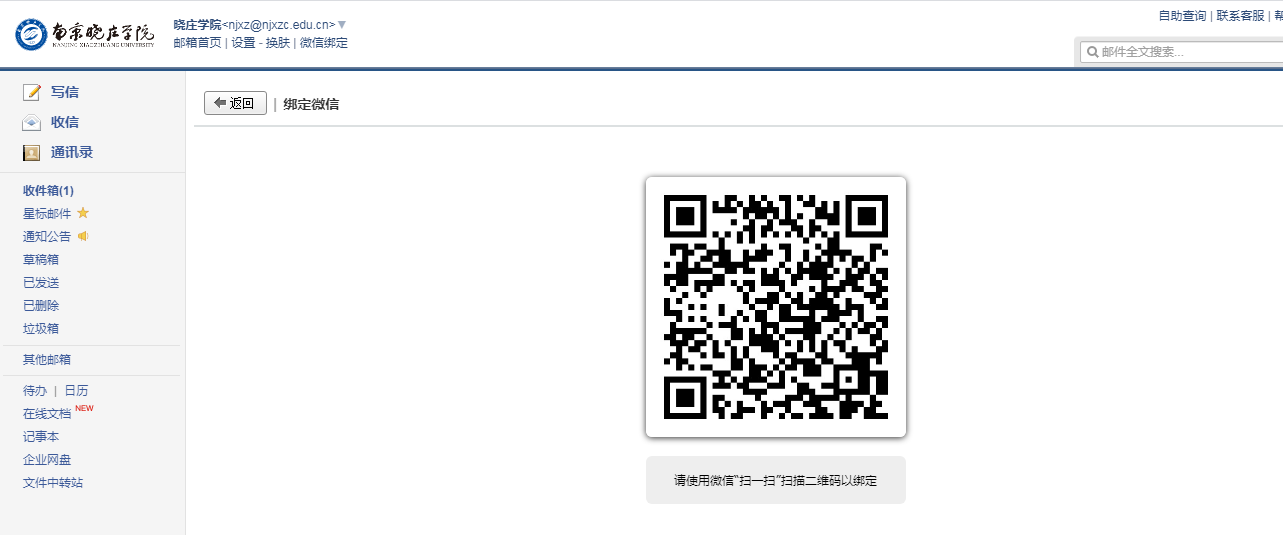 (1)点击邮箱左上角“微信绑定”,跳转到二维码页面,进行绑定。